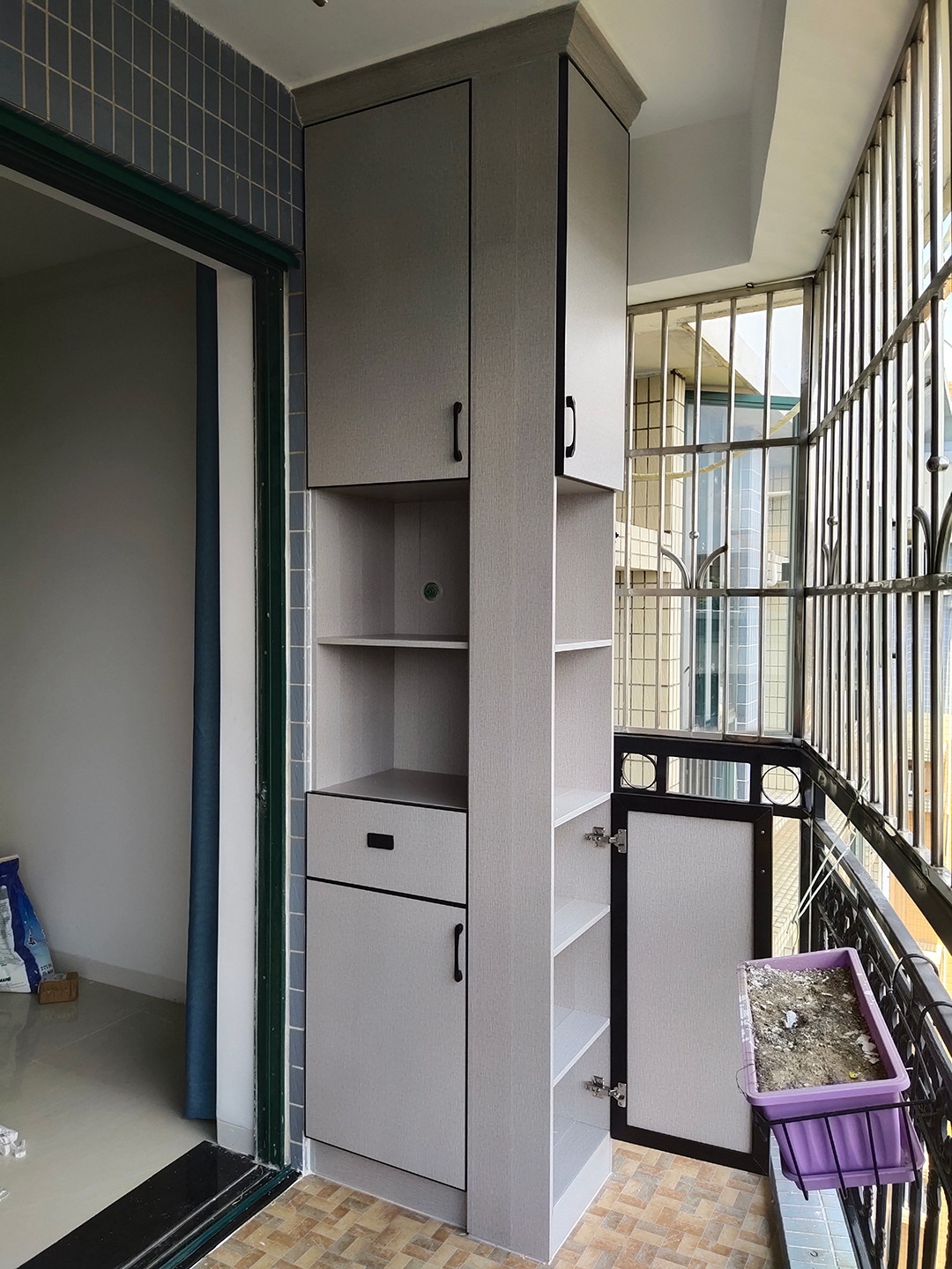 如果家里收納壓力比較大,可以考慮在陽臺裝一個收納柜。收納柜內的物品可能是書籍、鞋子、衣服等等,所以柜子的尺寸、結構也要根據實際需求來定。