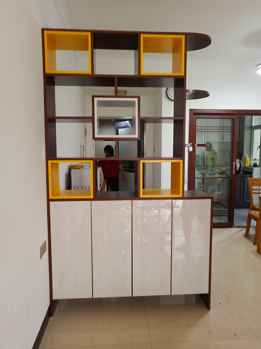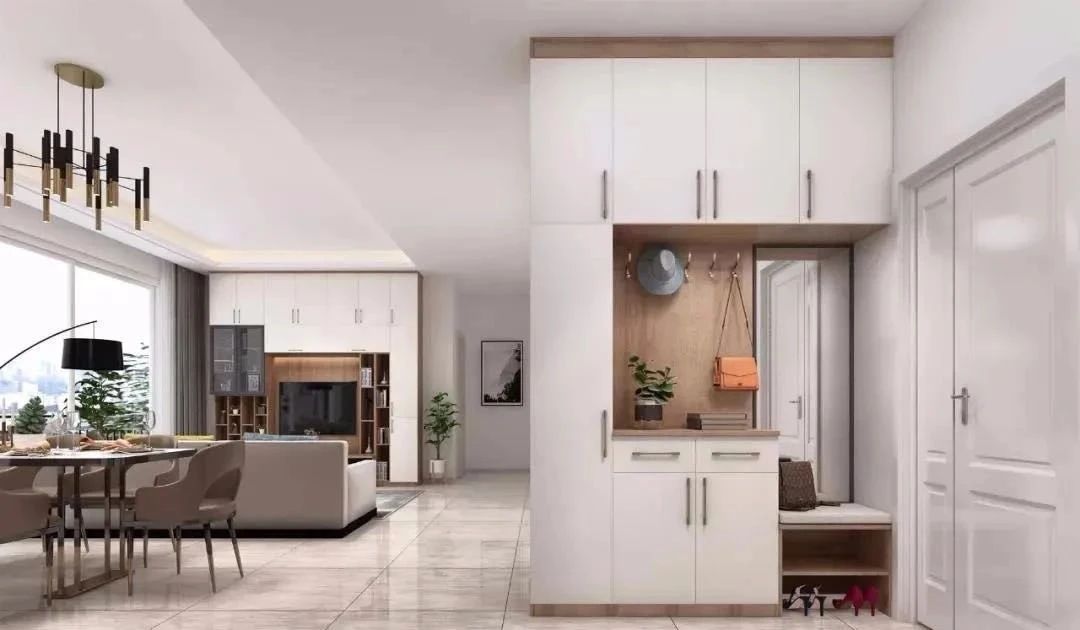 化解"開門見廳"的布局缺陷,最簡單的方法就是規劃隔斷。實用且方便的設計便是定制柜體,提升客廳的私密性和安全感,柜體形式應空間風格加以變化,形成入戶的一道美景。