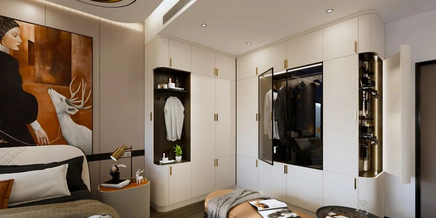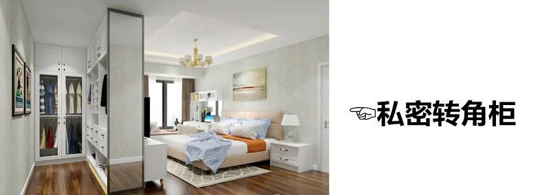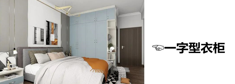 與入戶門平行的墻面,打造一字型衣柜的布局,適合大多數臥室的戶型。市面上一字型衣柜非常多,如何能在衣柜上再演變出許多新功能衣柜。既能滿足我們的衣柜收納各種需求,還能讓空間內顏值倍增。如果衣柜到床的距離大于80cm,可以設計轉角衣柜,利用死角空間,收納能力MAX!