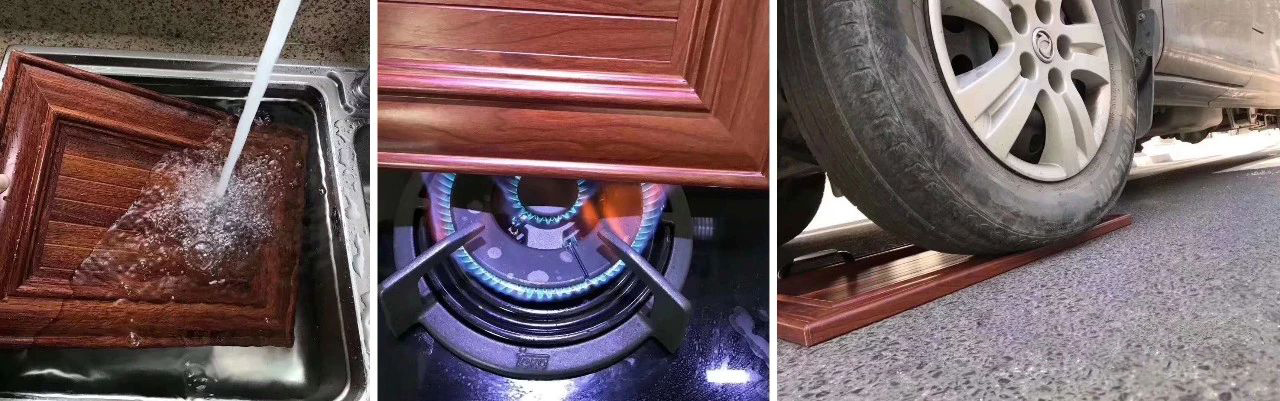 用打火機測試,顆粒復合板家居明顯的灼燒痕跡,木紋鋁板家居沒有絲毫灼燒痕跡,木紋鋁板家居完全不怕明火的傷害。