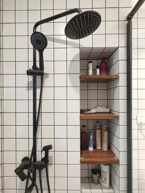 如果家里還沒裝修的,可以考慮壁龕設計,壁龕顏值也比較高。壁龕在衛浴間用的比較多,小戶型衛生間空間本身就小,沐浴露、洗發水等需要收納的東西又很多,墻上開個壁龕就能解決這些問題,還省了收納用具。