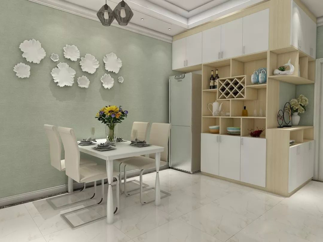 如果餐廳靠大門,那正好把玄關(guān)也合并起來。充分利用墻體轉(zhuǎn)角空間,打造L型餐邊柜,靠門的那一面墻用作玄關(guān)。
