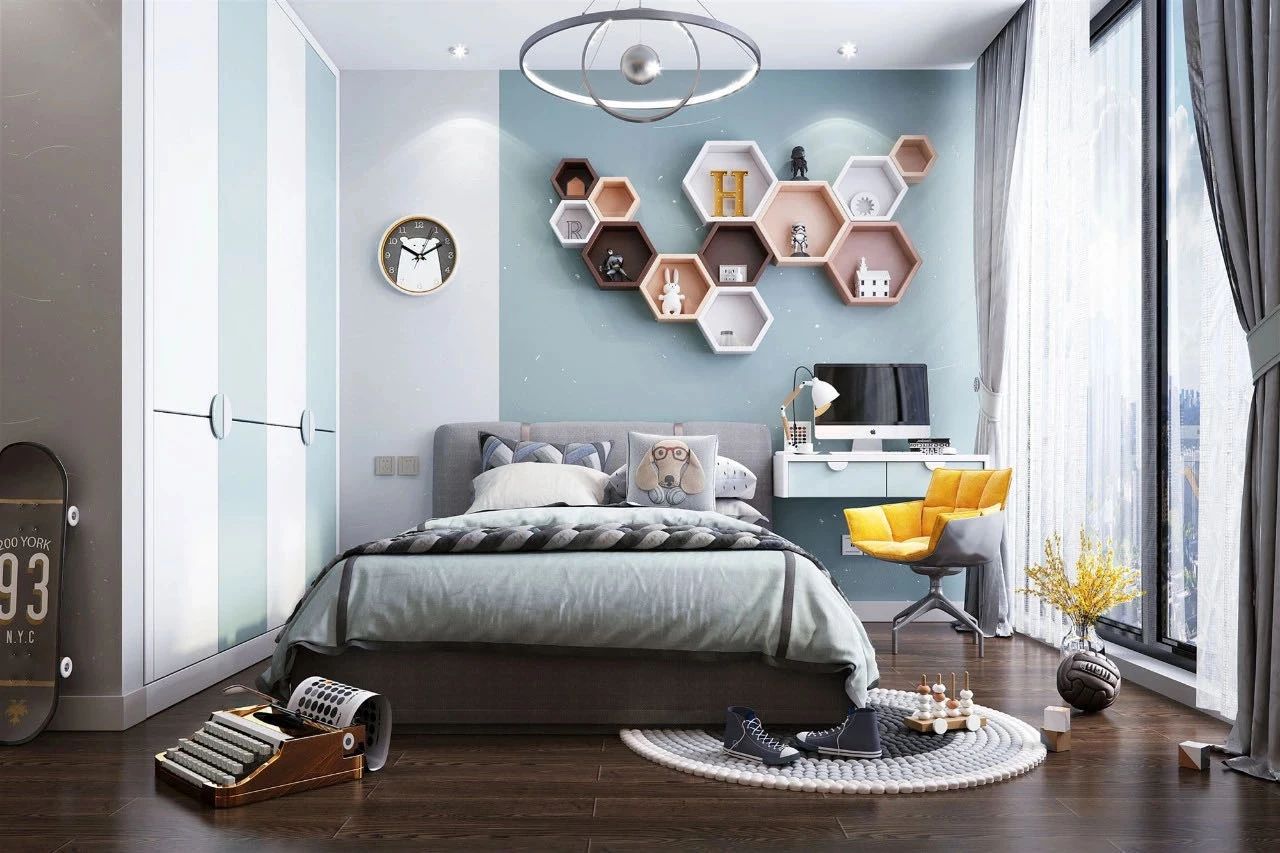 6歲以上孩子,考慮到增加了學(xué)習(xí)功能區(qū),一般盡量以中性或淡雅色調(diào)為主,輔色則根據(jù)孩子喜好進行選擇。