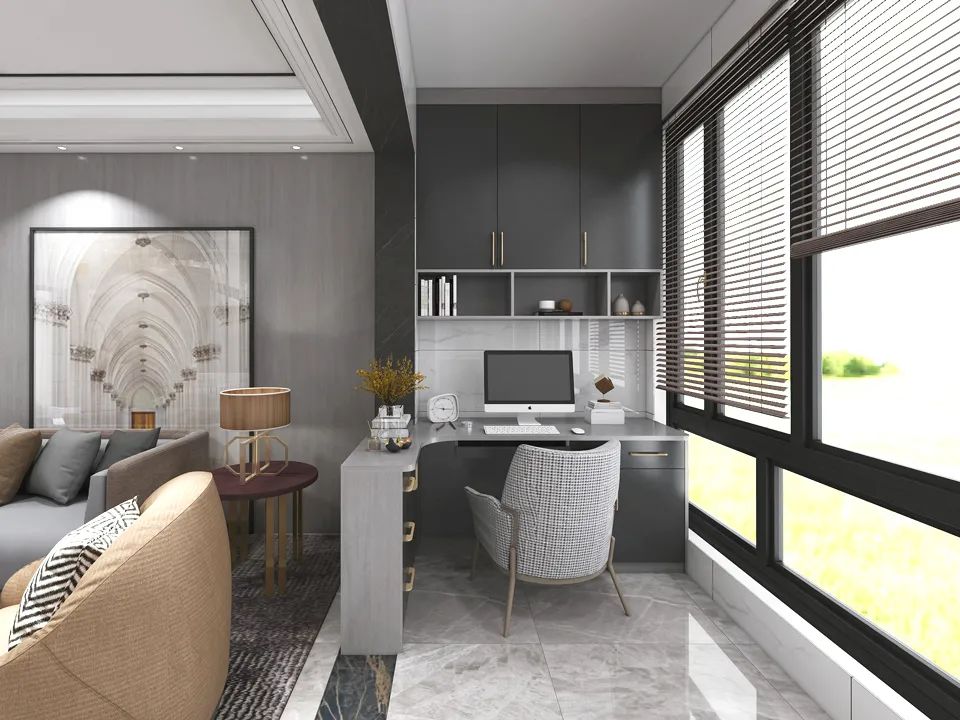 工作是嚴謹的、認真的、一絲不茍的,工作陽臺同樣如此。因此,工作空間的全鋁陽臺柜,以冷靜理性的色調,塑造嚴肅的空間。