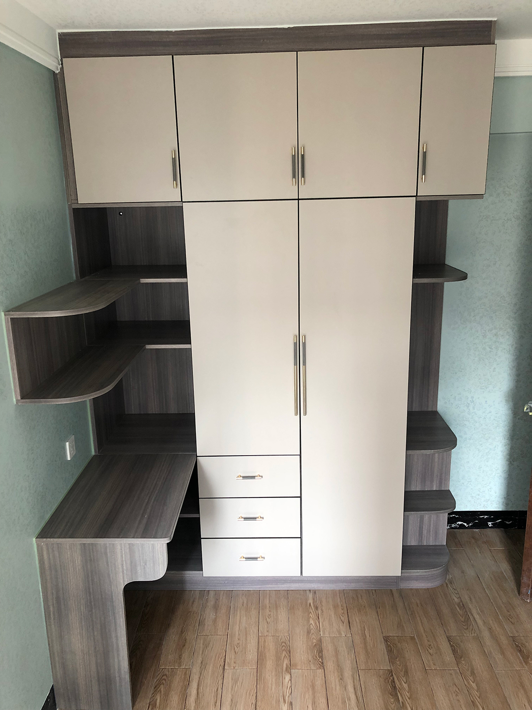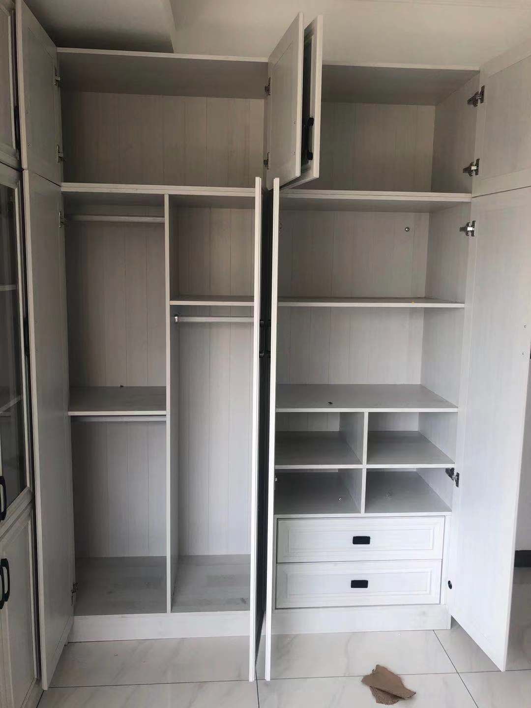 這種款式,一般用行現(xiàn)代、簡約風格。門板有造型,外置拉手,不配抽屜。建議是做內部抽屜,隔板收納盡量多設幾層。