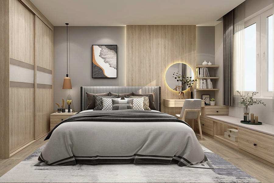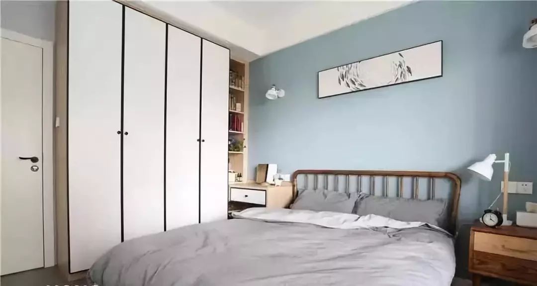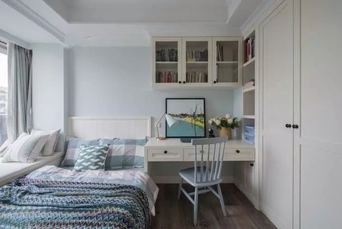 設計時,也可以根據(jù)面積,做一些適用的調整,如放不下床頭柜,可以利用靠床的一側柜子,做床頭柜設計,實用也美觀。