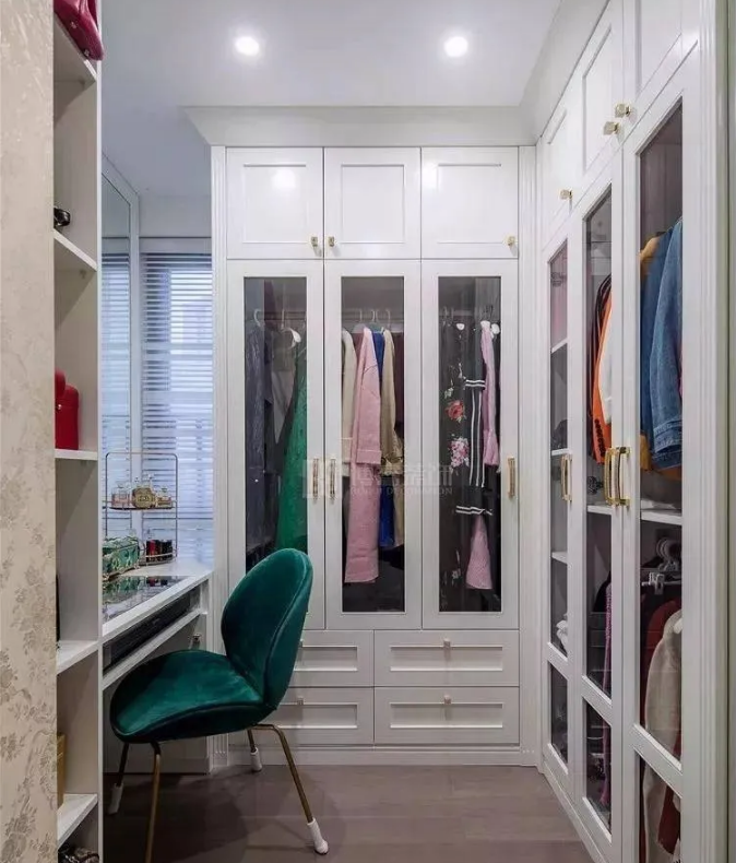 部分專賣店為了展示效果,通常采用無門式的衣柜設計,漂亮衣服整齊的掛在衣柜內,再搭配上各式的包包、領帶等,看起來很美觀,導致很多用戶家里把也設計成了無門式。使用一段時間之后才發現,完全起不到防塵的作用。如果為了追求通透感,可以選擇玻璃柜門。