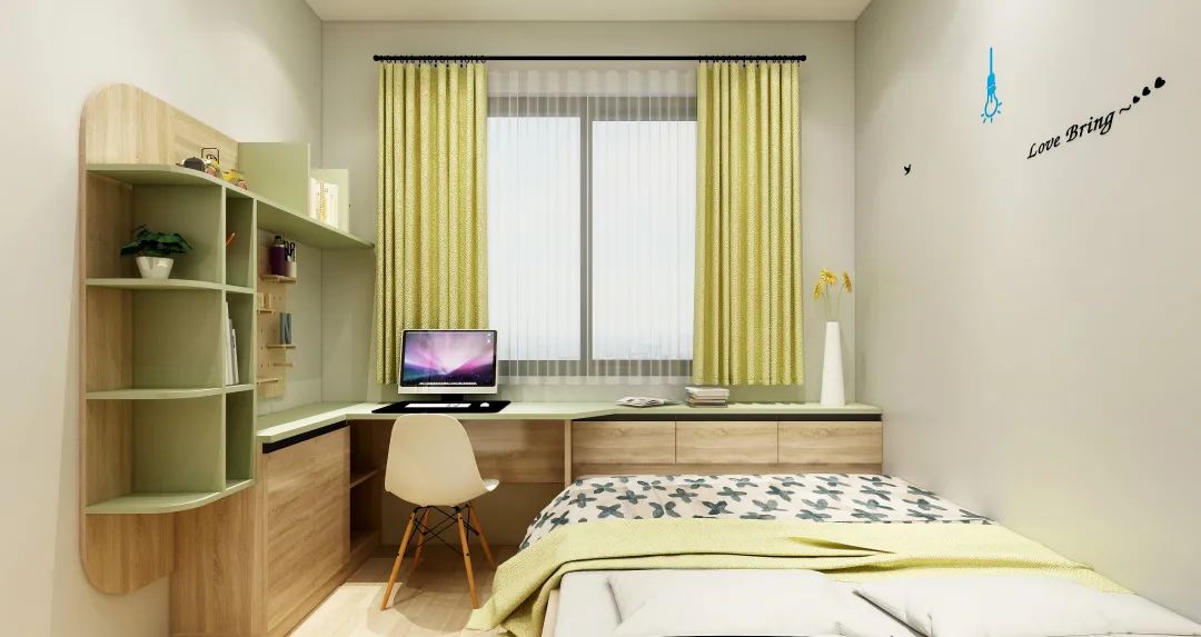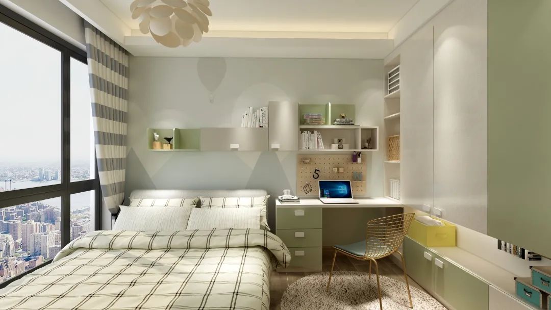 以“自然”為主題的榻榻米多功能房,以原木色作為柜身,門板用煙雨綠作為點綴,搭配黃色的窗簾和被褥,猶如樹干、綠葉和探出頭的小黃花,帶你感受自然的氣息。