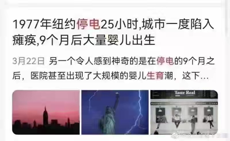 7、第一,東北正在下一盤大棋,用限電的方式,解決東北生育率過低的問題。因為據說,1977年紐約停電25小時,9個月后大量嬰兒出生。所以,限電是為了提高東北生育率。