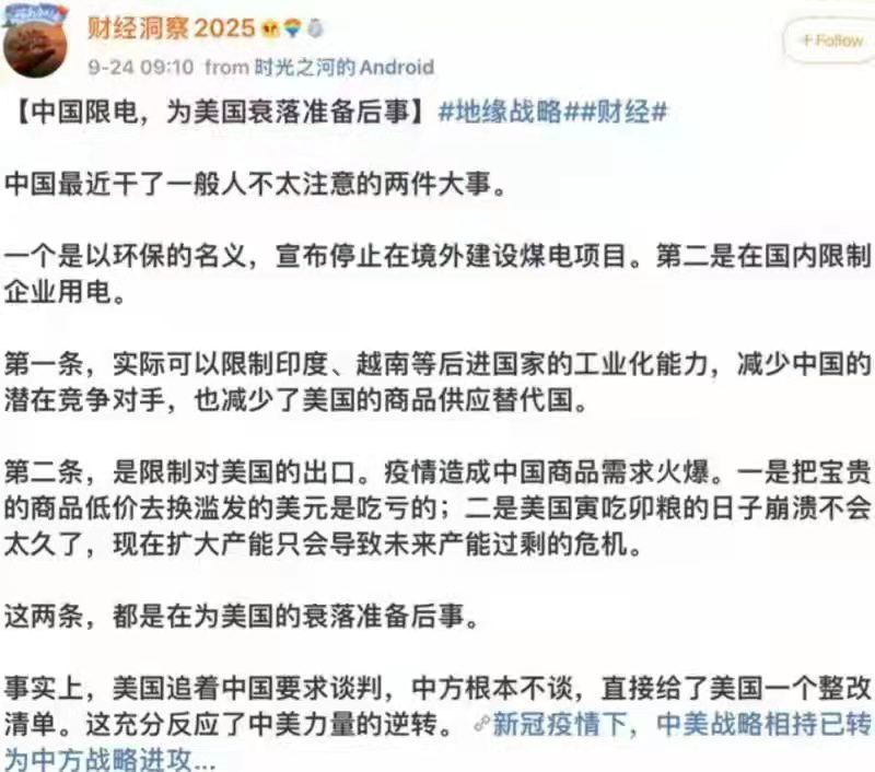 8、第二,限制中國產能,從而限制對美國的出口。因為疫情之后,海外對中國商品的需求劇增,但是把產能提上去,去換美國超發的貨幣是吃虧的。所以,限電是為了,降低產能,“唱衰美國”。