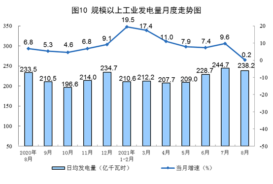先來看一組數據,在規模以上工業發電量月度走勢圖中,可以看到今年8月的日均發電量僅為238.2億千瓦時。